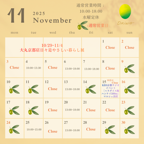2025/10/30 2025年11月の営業日カレンダー 2025年11月の営業日カレンダーです。 水曜日の定休日に加え、休み、営業時間変更になっている日が多いのでご来店前にご確認をお願いいたします。 tagPlaceholderカテゴリ: コメントをお書きください コメント: 0